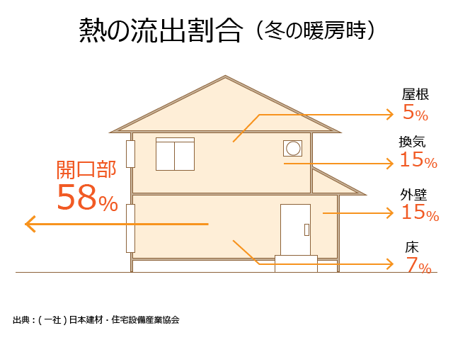 冬の暖房時に家から逃げる熱のうち、窓やドアの開口部を通るものは約半分。暖房の熱を逃がさず、少ないエネルギーで効率よく部屋全体を暖めるためには、開口部の断熱性を高めることが重要です。