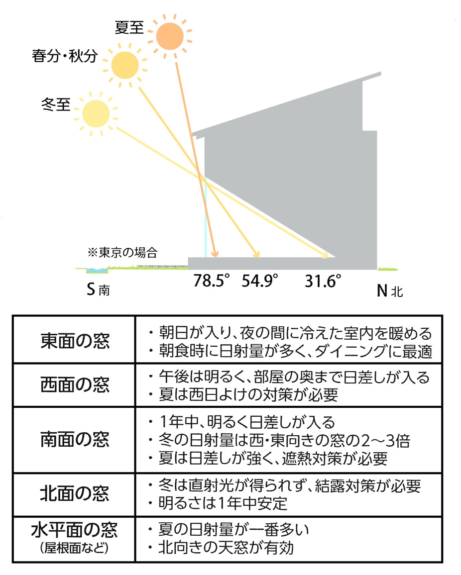 夏は光や熱をさえぎる工夫も重要に。南面の窓にはひさし、西面にはルーバーを取り付けることでの日差遮蔽対策が有効です。