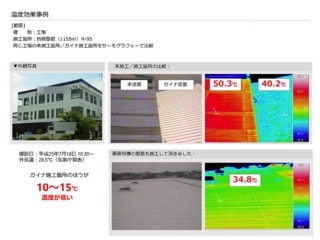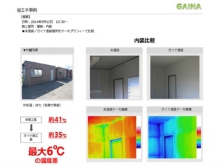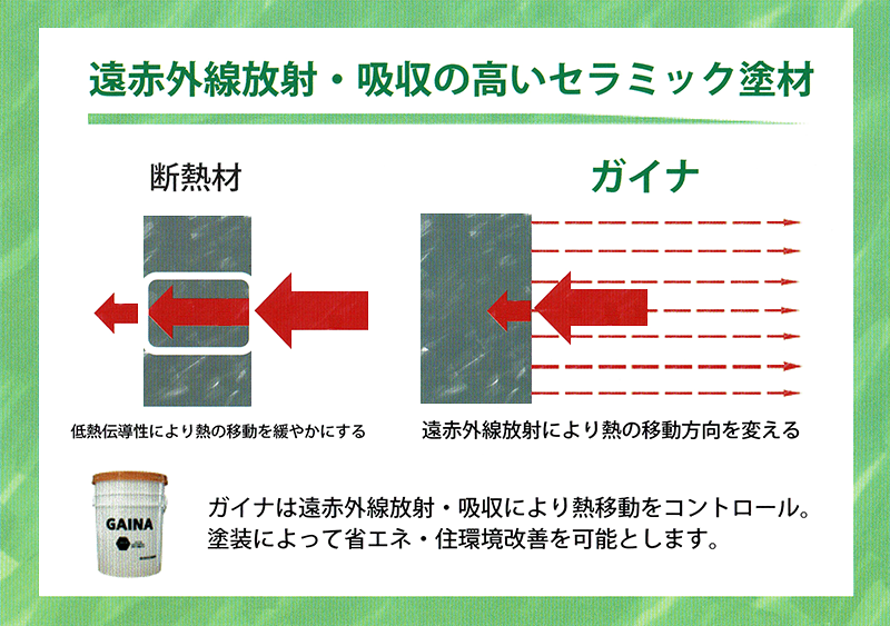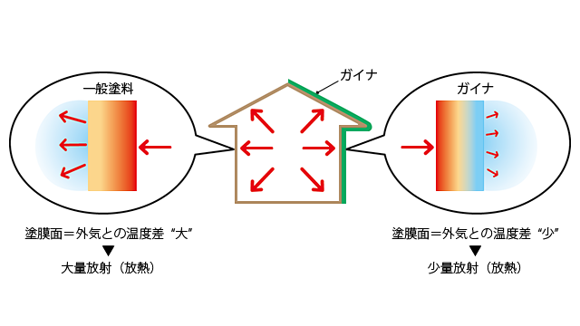 ガイナを外装に施工すると、外の空気温度とガイナを塗布した表面温度が適応することによって熱の均衡化が起き、その表面で熱の移動を最小限に抑えます。