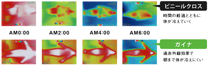 島根大学との共同研究では、内装にガイナを塗装した空間とビニールクロスを施工した空間における就寝時の体温の推移を測定。ガイナ室内塗装空間は、遠赤外線の効果で朝方まで体温が低下しにくい結果となりました。