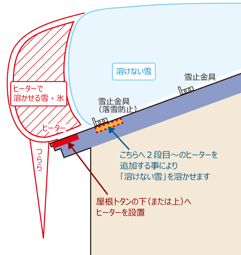 屋根トタンの下(又は上)へ電気ヒーターを設置し、雪や氷を溶かします。
