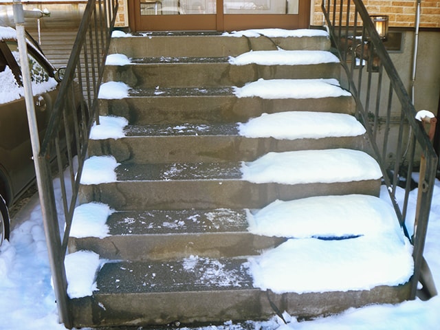 *雪かきの悩み *玄関前の雪 *歩道の雪 *階段・スロープの雪 *凍結 *歩くところだけ *屋上