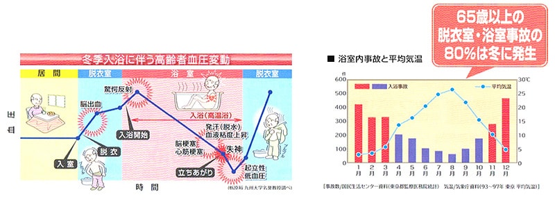 ヒートショックは、室内と脱衣室・浴室との温度差により血圧が急上昇・急低下することにより起こります。健康管理のためにも脱衣室・浴室などを暖め、温度のバリアフリー化をおすすめします。