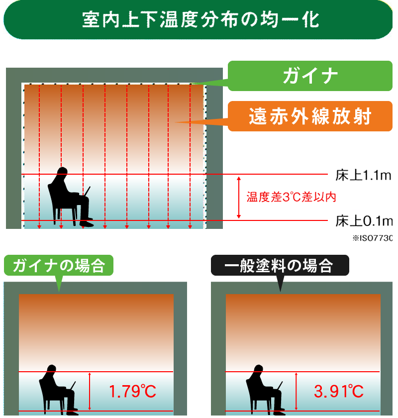 島根大学との共同研究では、内装にガイナを塗装した空間とビニールクロスを施工した空間における就寝時の体温の推移を測定。ガイナ室内塗装空間は、遠赤外線の効果で朝方まで体温が低下しにくい結果となりました。