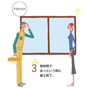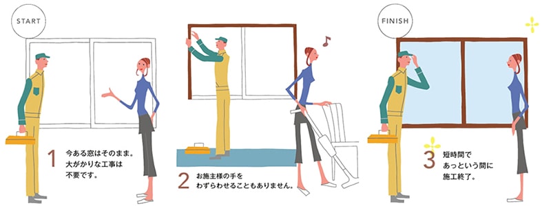 今ある窓の内側に窓枠を取り付けるだけだから、一窓あたり約1時間。家一棟でも1日で工事完了。