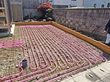 空気熱ヒートポンプにて沸かした温水(不凍液)を、地面へ埋設した配管へ循環させる方式のロードヒーターです。